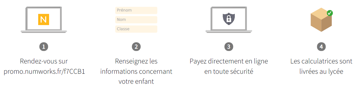 Les élèves ayant besoin de s'équiper d'une calculatrice Numworks neuve peuvent profiter de notre commande groupée jusqu'au 14 septembre 2025 permettant de bénéficier d'un tarif préférentiel (74,69 € au lieu de 82,99 € prix public) et d'une livraison au lycée fin septembre 2025.