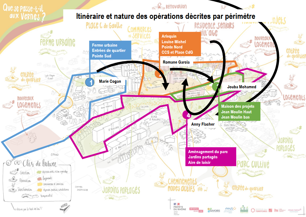 4 groupes, accompagnés chacun par un professeur, devaient suivre un itinéraire (document joint) leur permettant de rencontrer en plusieurs lieux des acteurs œuvrant à la rénovation de ce quartier urbain issu de l'époque de l'industrialisation de Givors (Ferme urbaine, Pointe Nord avec la rénovation urbaine, la Maison des projets à Jean Moulin, l'Aménagement du parc et d'une aire de loisir en contre bas de l'école Romain Rolland).